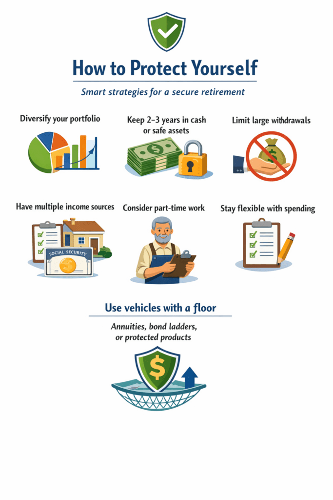 While no strategy eliminates risk, preparation can dramatically improve outcomes. Financial experts often recommend maintaining a diversified portfolio, keeping several years of expenses in safer assets or cash (typically 2–3 years), avoiding large withdrawals early in retirement, planning multiple income sources, staying flexible about spending, considering part-time work during downturns, reviewing plans regularly, and using vehicles with a floor, such as annuities, IUL insurances or structured products that guarantee a minimum balance to protect against severe market drops.